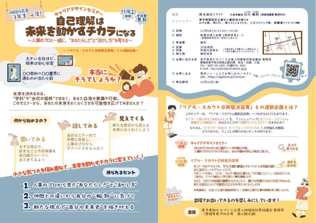 さて、11/8(土)に、四国内高専3年生をメイン対象にした、キャリアデザインセミナー「自己理解は未来を動かすチカラになる~人事のプロと一緒に“あなたらしさ”と“活かし方”を考える~」が開催されました(良いセミナータイトルですね~。気に入っています。付けたのも私ですけど😙)。